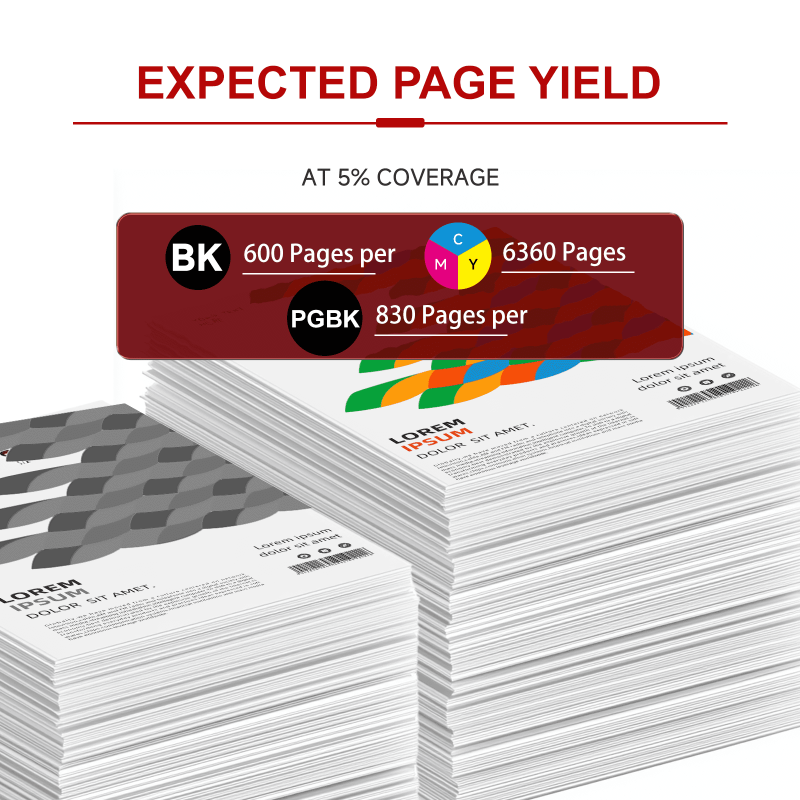 - High Page Yield:Up to 600 pages per PGBK ink cartridge and 6360 pages per black ink cartridge; Up to 830 pages per cyan/magenta/yellow ink cartridge (at 5% coverage of A4 paper)
