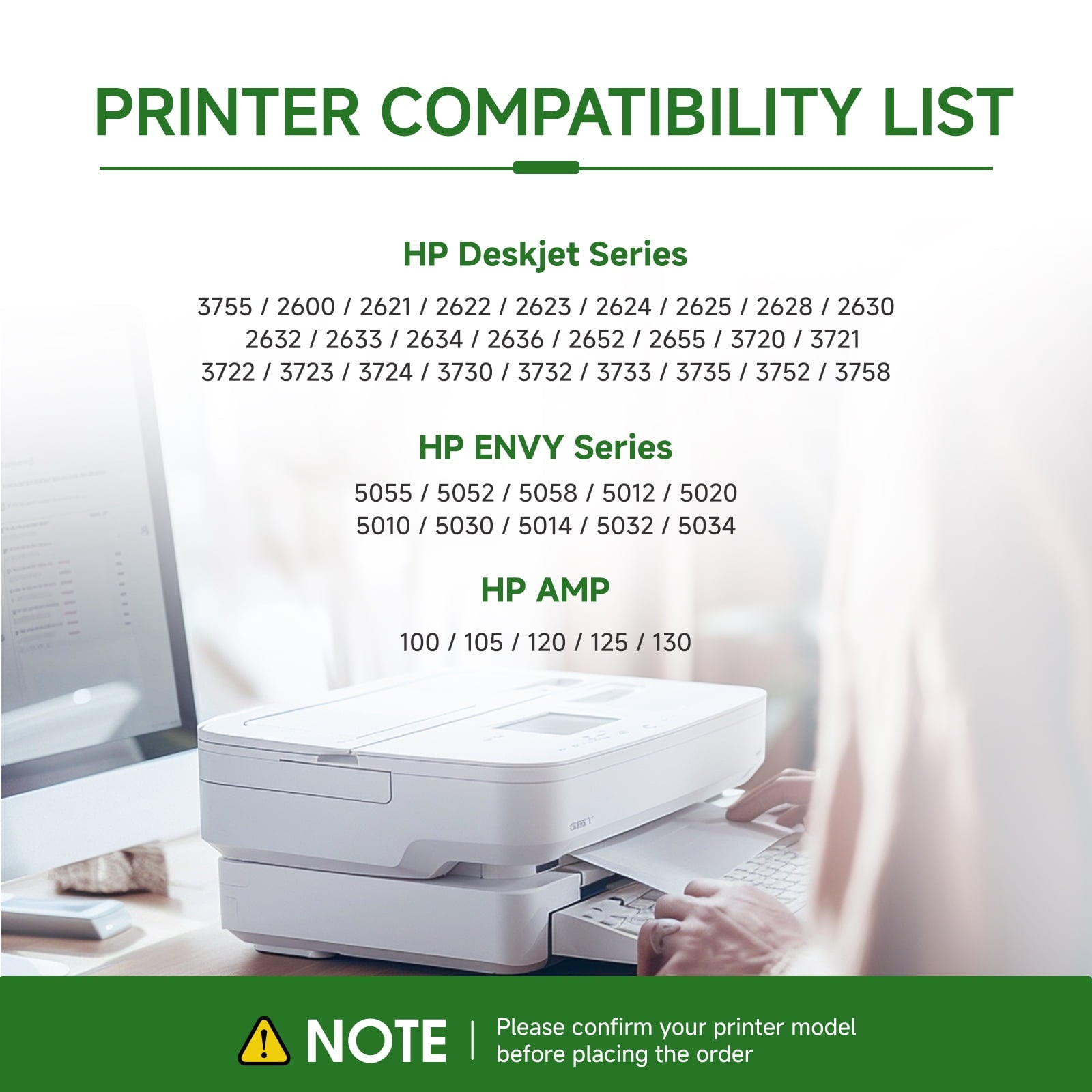 - Compatible with:HP Deskjet 3755 / 2600 / 2621 / 2622 / 2623 / 2624 / 2625 / 2628 / 2630 / 2632 / 2633 / 2634 / 2636 / 2652 / 2655 / 3720 / 3721 / 3722 / 3723 / 3724 / 3730 / 3732 / 3733 / 3735 / 3752 / 3758 HP Envy 5055 / 5052 / 5058 / 5012 / 5020 / 5010 / 5030 / 5014 / 5032 / 5034 HP AMP 100 / 105 / 120 / 125 / 130